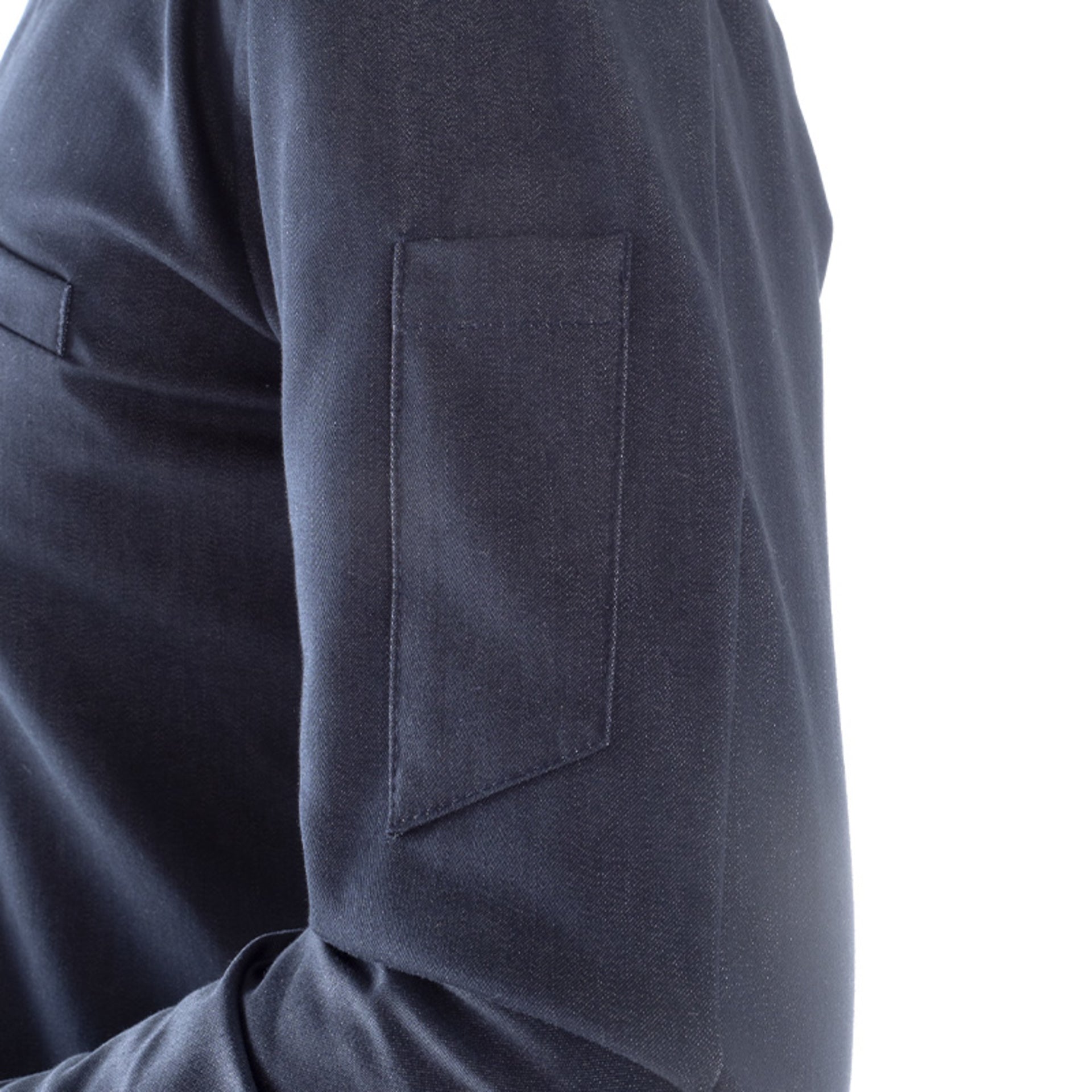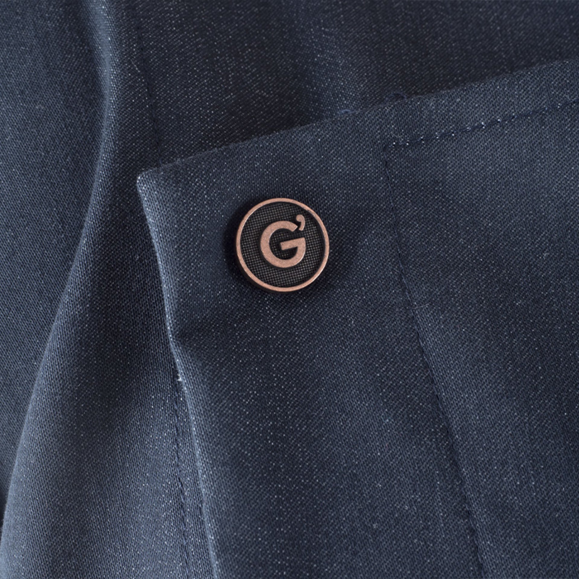 Die Jacke ist modern geschnitten und zeichnet sich durch eine Knopfleiste mit einem Druckknopf mit Logodruck in der neuesten Antik-Kupfer-Beschichtung aus, die den modernen Stil unterstreicht. Für Komfort sorgen der Stretchanteil im Stoff und die Schlitze am Rücken, die viel Bewegungsfreiheit und eine hervorragende Passform garantieren. Auch die neue Manschette wurde so konzipiert, dass sich der Ärmel leichter aufrollen lässt. Abgerundet wird die Jacke Eric durch den Stifthalter am linken Ärmel, der aus grauen Nähten mit kontrastierendem Garn besteht, und das Knopfloch, das mit einem passenden Druckknopf verankert ist.