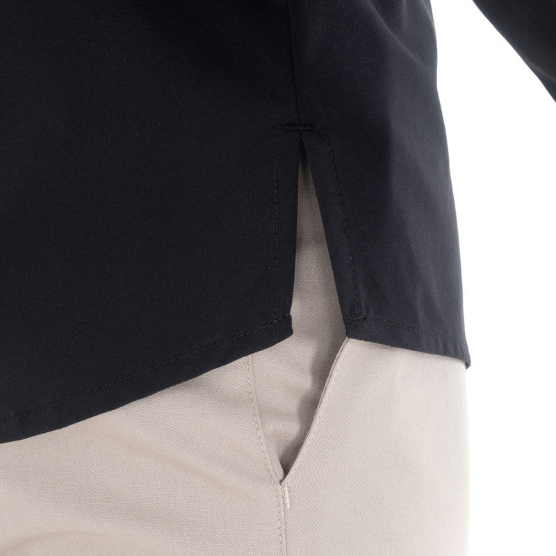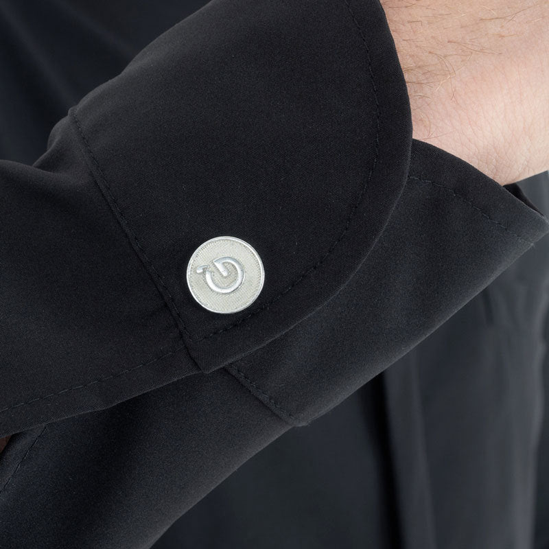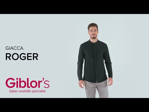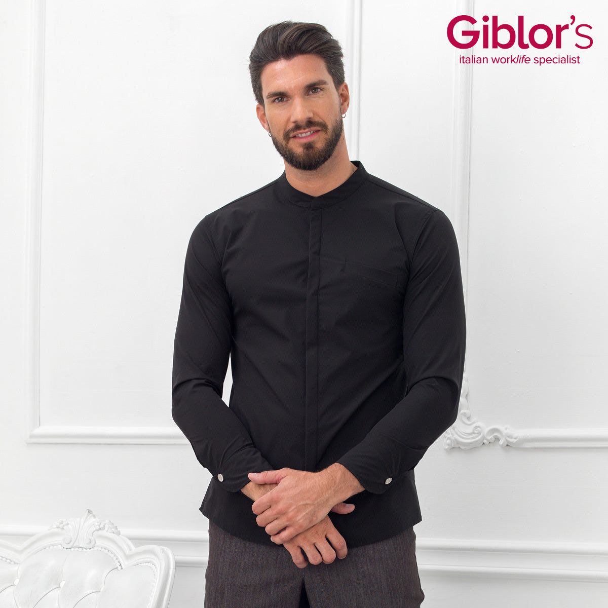 Die Roger-Jacke von Giblor's ist ein charismatisches und transversales Kleidungsstück. In der neue Giblor's Green&Clean Stoff mit schmutzabweisende Technologie. Der neue Vorschlag basiert auf dem Kreuzgewebe, das mit dem biokompatiblen Sorona®-Garn hergestellt wird, das außergewöhnliche elastische Eigenschaften garantiert. Es handelt sich um ein Gewebe, das gegen hohe Temperaturen und Bleichspritzer resistent und pflegeleicht ist. Das Kleidungsstück hat lange Ärmel und eine Slim Fit Passform. Ein koreanischer Kragen rahmt das Kleidungsstück ein. Die vordere Knopfleiste hat 7 Druckknöpfe, die mit einer Nickelschicht überzogen sind. Besonders hervorzuheben sind die Manschetten, die einen Druckknopf mit dem „G“-Logo in der Nickelgalvanisierung haben, der sich von dem schwarzen Variantenstoff abhebt. Auf der Herzseite ist eine querliegende, modern anmutende Brusttasche angebracht. Die Näthe sind alle in der gleichen Farbe wie der Stoff in Schwarz gehalten.